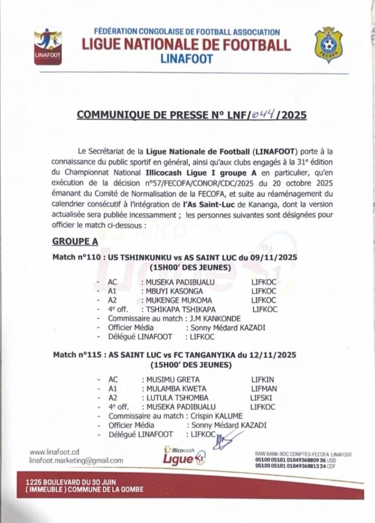 Conformément à la décision Numéro 57/FECOFA/CONORE/CDC/2025 du 20 Octobre 2025 émanant du comité de normalisation de la FECOFA, bien exécutée par le communiqué de la LINAFOOT ci-haut cité, l’AS Saint Luc a été réintégré à la 31 ème édition du championnat national Illicocach Ligue1 et pour ce faire, un programme adapté a été publié pour lui permettre de jouer ses matchs de retard à fin d’atteindre le niveau des autres clubs déjà engagés dans la compétition.